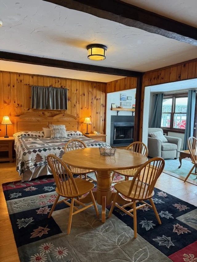 This suite 126 has a king bed, fireplace, whirlpool tub, kitchenette and dining table. An adjoining standard room with 2 queen beds and a private bath can be added to accommodate up to 6 people. For most concise information contact property directly to reserve these two units together.